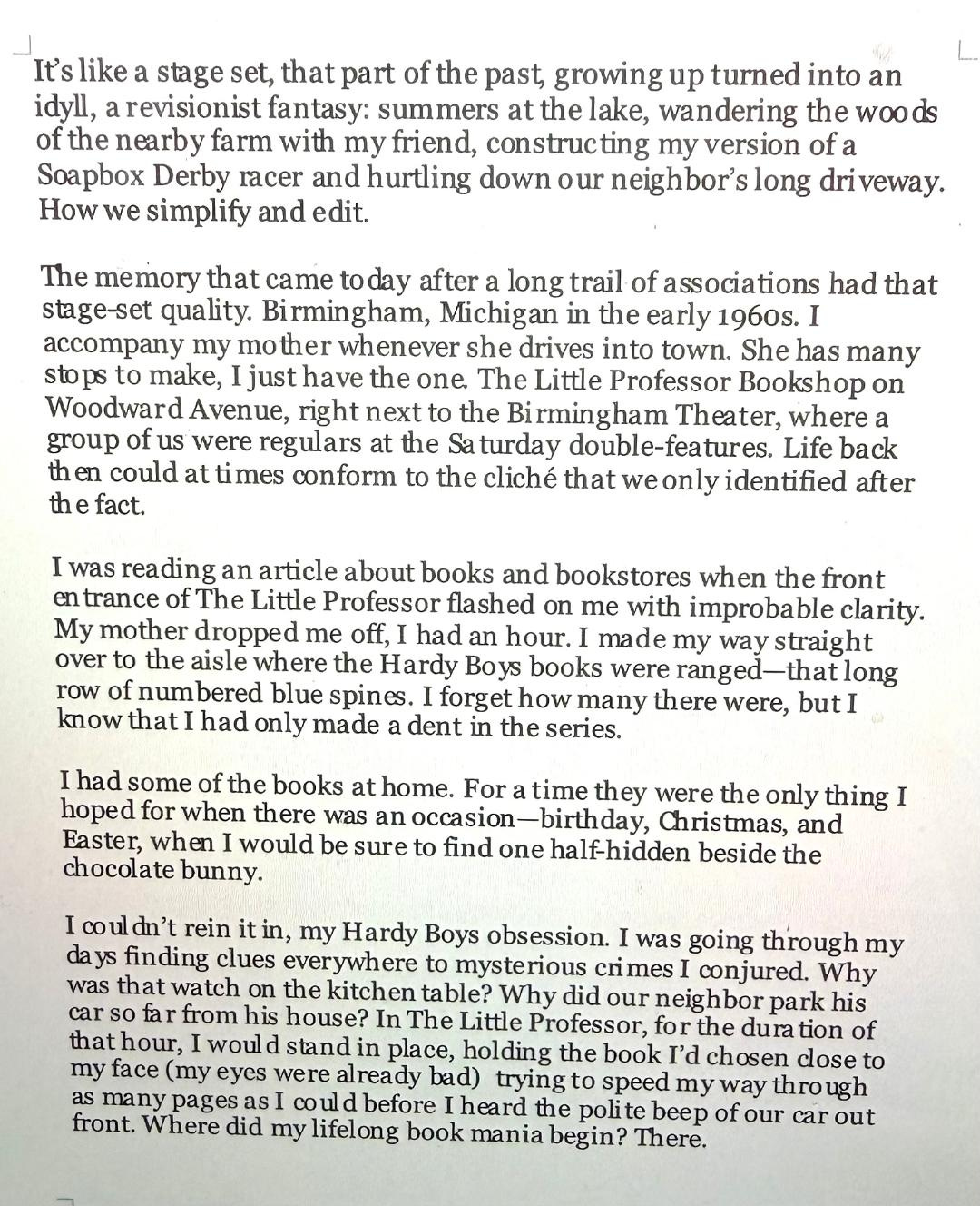 We coveted Hardy Boys books. My friend Mickey had a much larger set. I marveled at the long line of blue spines on his bookshelf set at arm’s length from his bed. You had to lean in to differentiate each one. They sat on a shelf down from his dog-eared Tarzan paperbacks. It was hard to know where to begin. We usually sat in silence, reading.